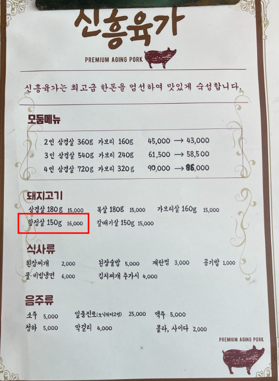 신흥육가 의정부 역 맛집 안녕하세요 오늘은 신흥육가 의정부 역 맛집 소개드리겠습니다 신흥육가 소개 ▶업체명 : 신흥육가 ▶ 주소 : 경기도 의정부시 의정부동 431-22 지상1층(주2) /의정부역 2번 출구189m 도보에 있어요 ▶전화번호 : 031 - 928 - 1605 ▶ 주차장은 웨딩더낙원 본관 뒷편 또는 웨딩더낙원 핑크건물 주차장에 주차가능하세요 ▶ 친절하게 고기를 구어주시니 먹기만 하면 되용 ▶ 에어컨이 빵빵해서 불판앞에서 고기구어도 덥지 않습니다 ▶ 처음 반찬은 셋팅하여 주시나 추가 반찬은 셀프바를 이용해야 합니다 ▶ 김치찌개는 기본으로 제공 되어요 ▶ 명이나물이 맛있는데 셀프바에서 무한 먹을 수 있어 좋았답니다 메뉴 항정살 16,000원 (150g) (제일비싸요) 갈매기살 15,000원(150g) 가브리살 15,00.. This &That/맛집 2023.08.24