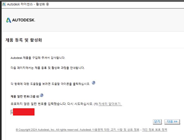 오토데스크 사용자 오류 (유효하지 않은 일련번호를 입력했습니다) 안녕하세요 오늘은 소개드리겠습니다 유효하지 않은 일련번호를 입력했습니다 제품 활성화시 일련번호 입력이 아닌 Autodesk ID로 로그인하신 후 사용하여야 합니다. Autodesk 홈페이지 접속 : https://www.autodesk.co.kr/계정 생성 1) 개인 메일로 발송된 초대 메일을 통해 계정 생성◆▶♣ 이상 소개를 마치겠습니다 좋은 날 되세요 ^^ 유용한 정보 더 둘러보기 Software 사용 설명서/Autodesk 2024.08.05