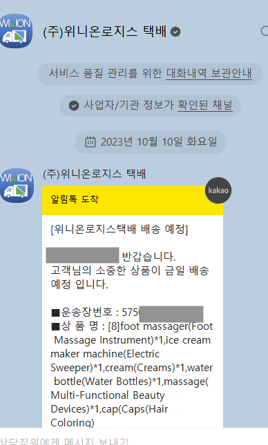 아래와 같이 위니온로지스 택배에서 알리익스프레스 물품  배송 메세지가 왔습니다 (룰루 신나 신나)