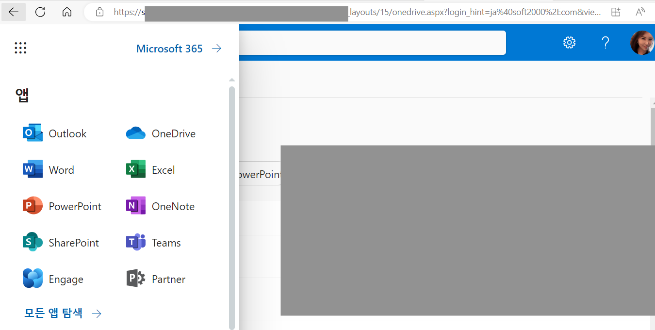 M365 사이트 로그인 하시고 쉐어포인트 링크 내 원드라이브를 선택합니다