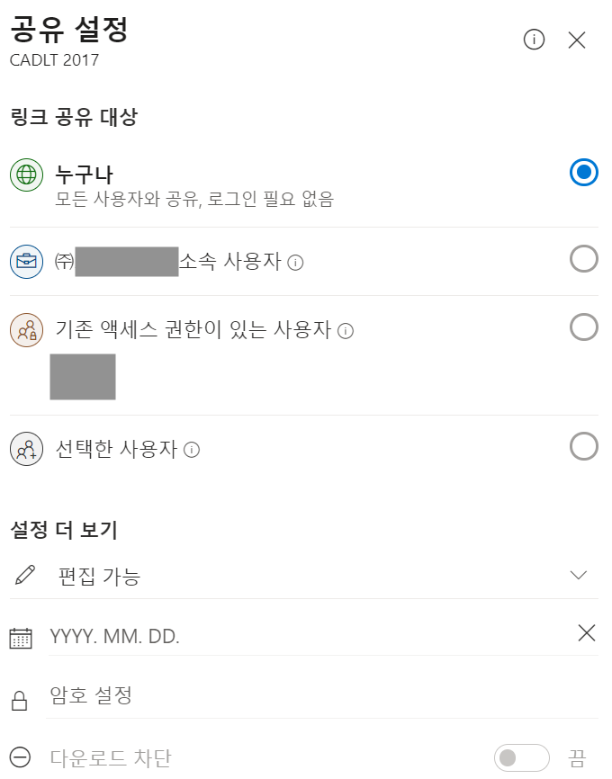 다음과 같이 누구나 , 회사동료 사용자 등등을 설정하거나 암호 및 링크 사용 기간을 정할수 있습니다