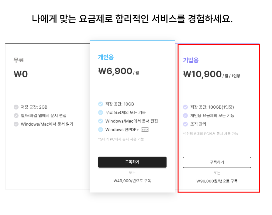 한컴 독수 사용 인원 10 추가 / 월구독 5개월 필요