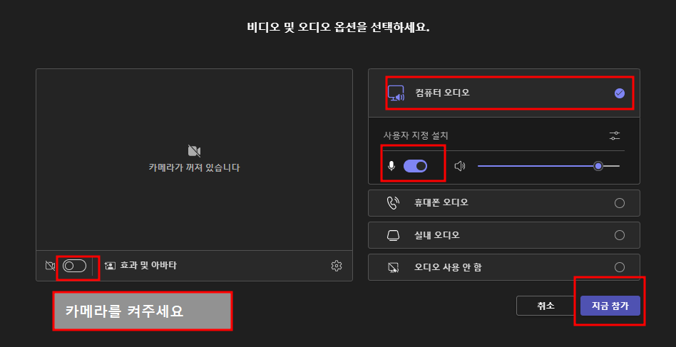 카메라를 켜고 오디오 및 스피커 설정 후 지금 참가를 클릭해 주세