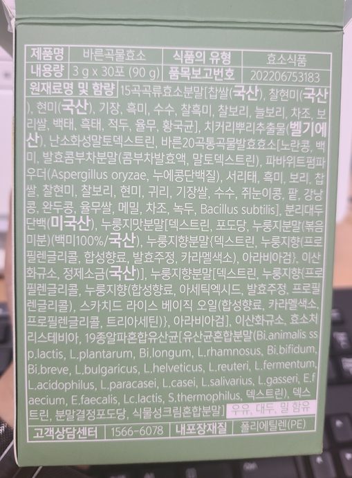 성  : 효소식품 3g 30 포(90g)  / 15곡곡류효소분말 27% / 바른 20곡 통곡물발효효소 13%