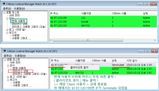 - 현재 캐디안 사용자를 조회하실 수 있으며, 특정 사용자를 강제 종료 가능.